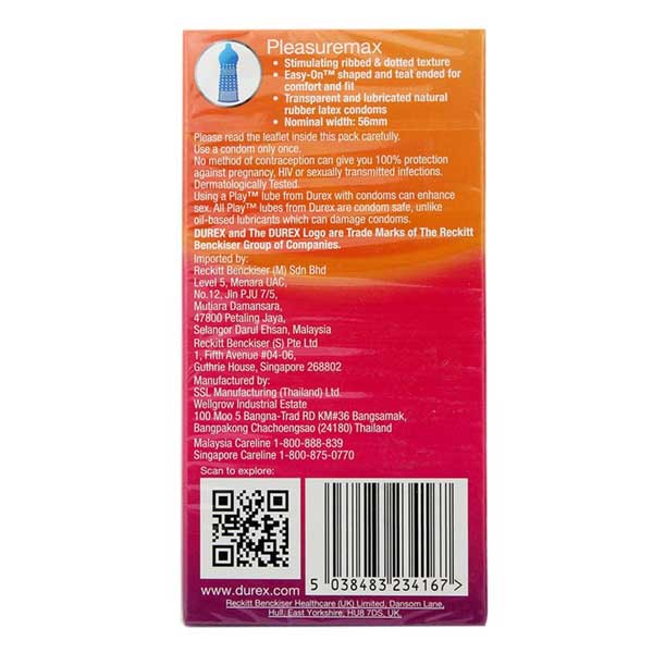 Durex Pleasuremax condoms are made from 100% natural latex, ensuring premium safety and comfort. The innovative ribbed and dotted texture targets sensitive nerve endings, stimulating the G-spot to maximize pleasure for her. With a slim yet secure fit of 56mm width and 180mm length, these condoms wrap snugly, heightening sensation and arousal for both partners. The product features a smooth, special lubricating gel that guarantees effortless movement and reduces discomfort, making every touch silky and enjoyable.